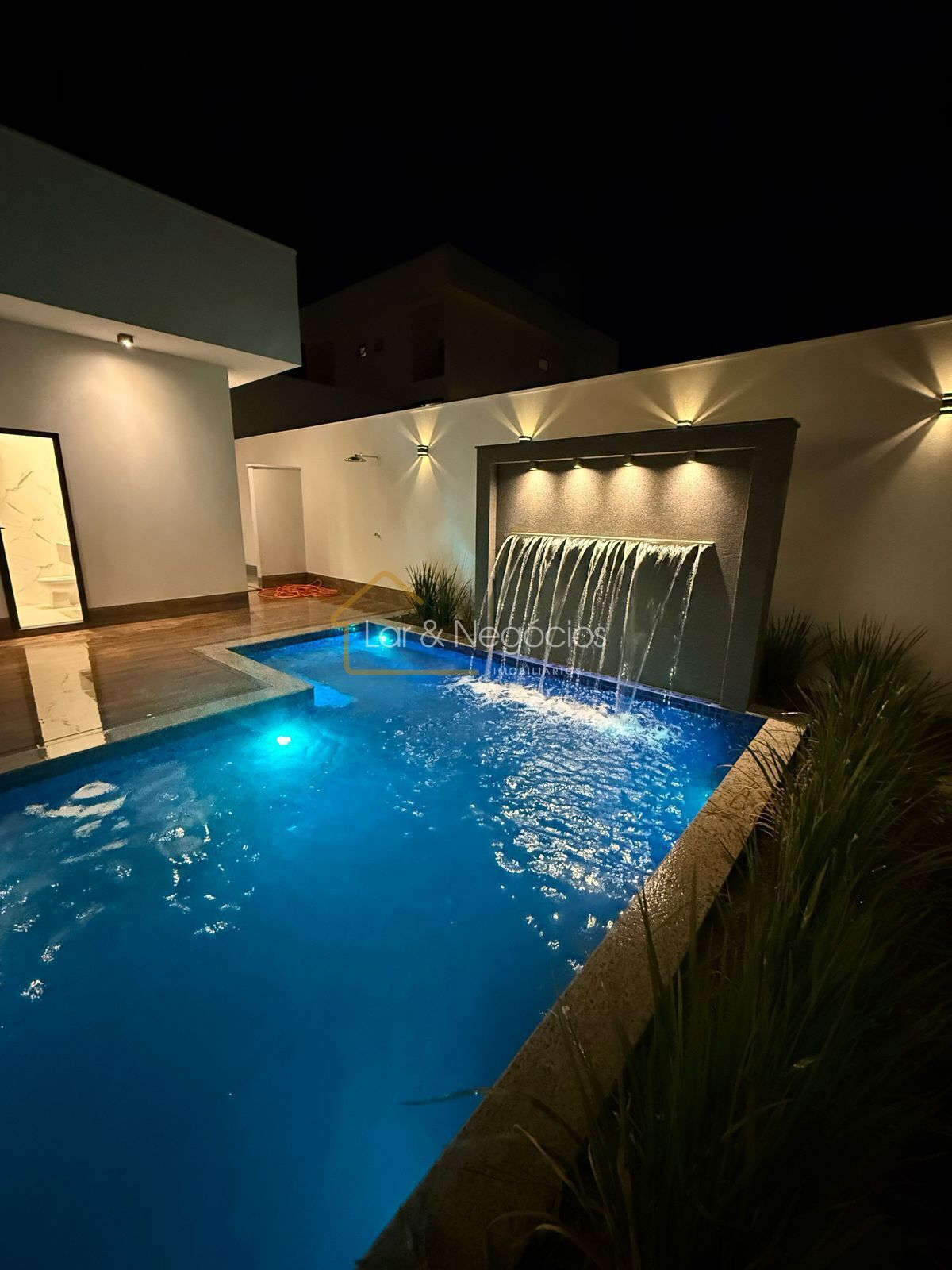 - Deck e piscina aquecida, com cascata, iluminação e hidromassagem